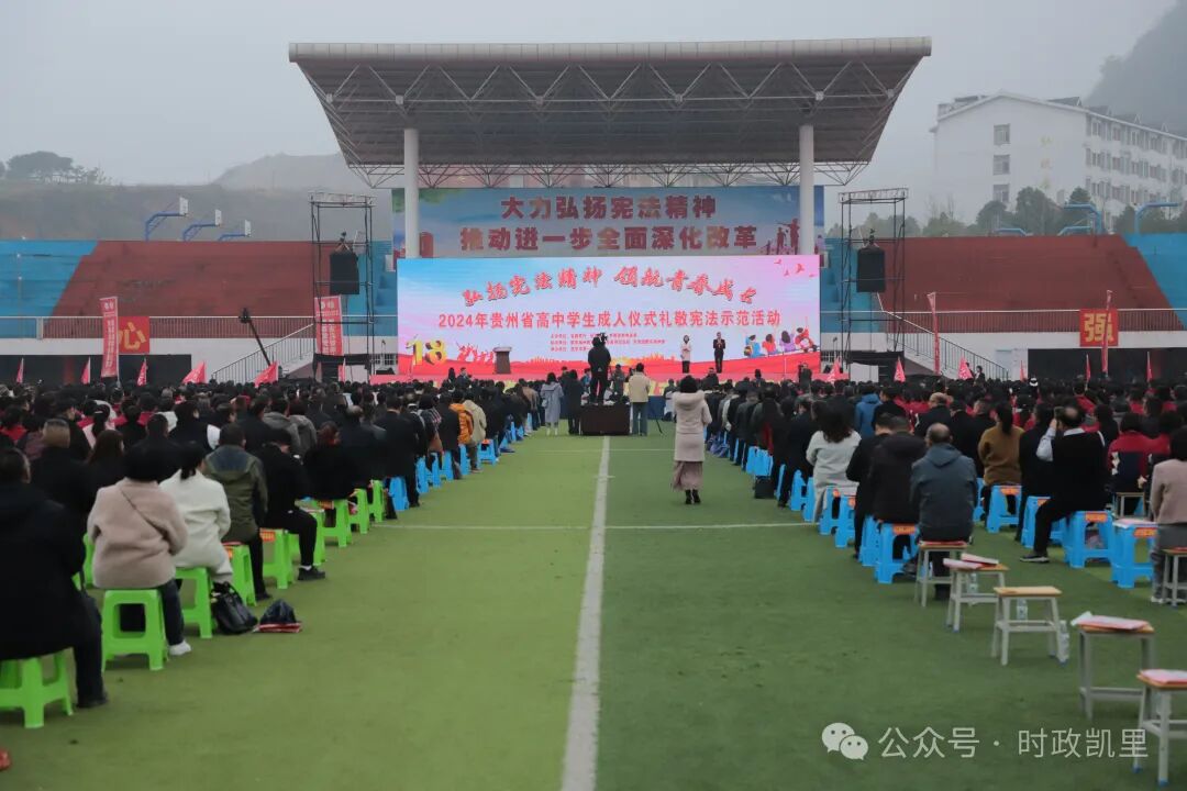 2024年贵州省高中学生成人仪式礼敬宪法示范活动由省教育厅、省司法厅、共青团贵州省委主办,黔东南州教育局、黔东南州司法局、共青团黔东南州委协办,凯里市第一中学承办,活动主题为“弘扬宪法精神·领航青春成长”。