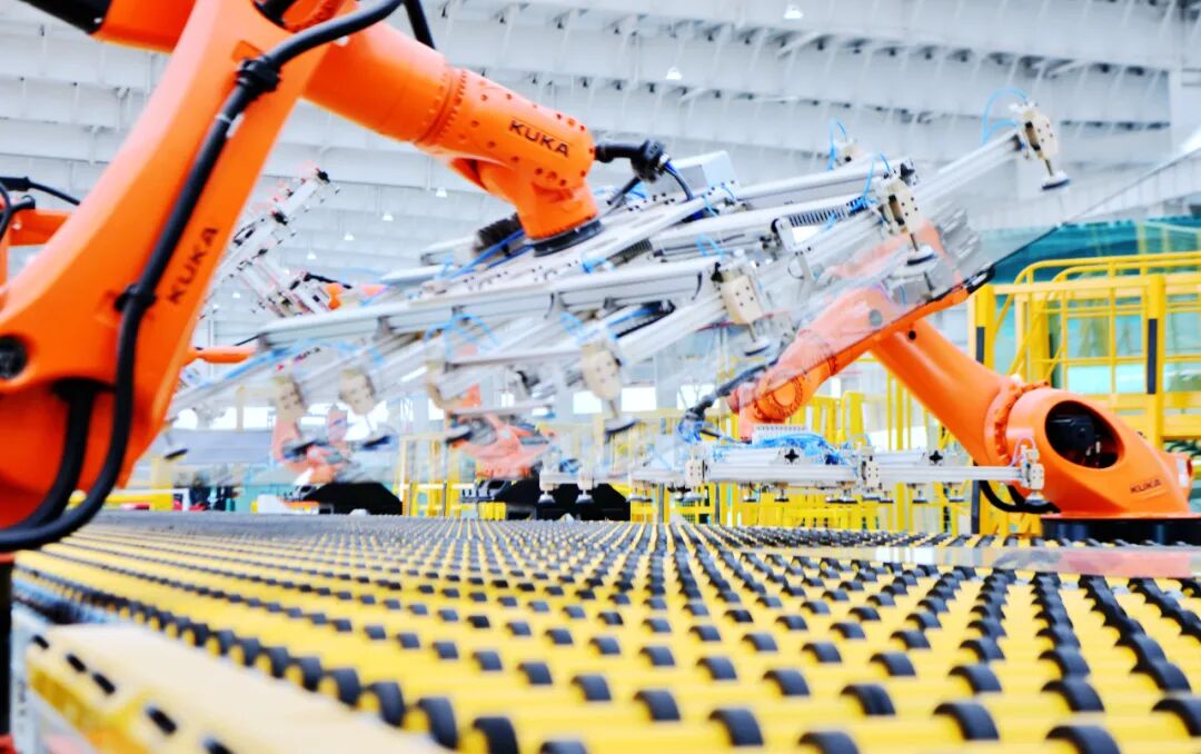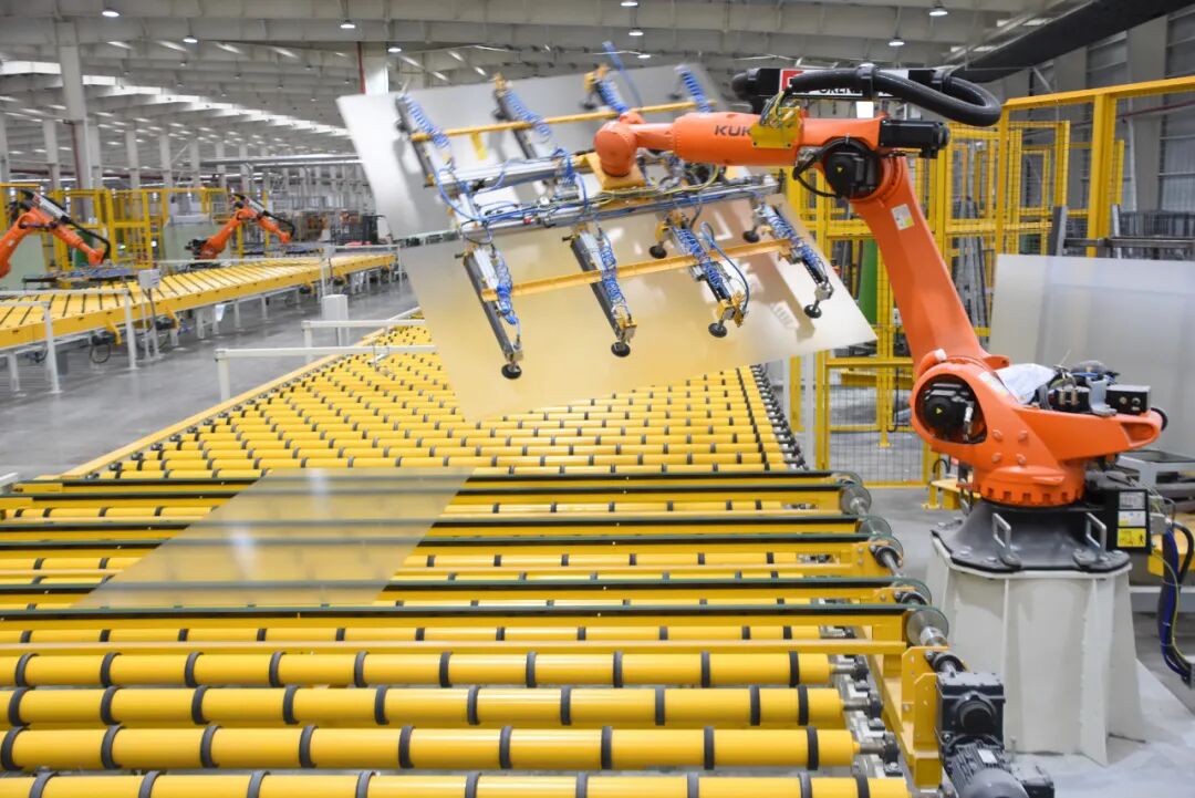 贵州海生玻璃公司的生产线上,机械臂自动抓取玻璃原片。(雷子德 摄)