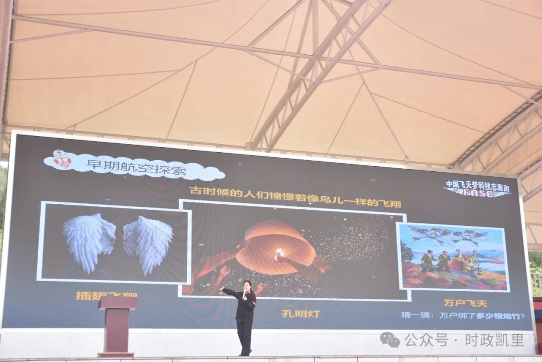 活动现场,气氛热烈而欢快,校园里彩旗飘扬,学生们手上拿着纸飞机,写着“我的梦想是一名飞行员”。中国飞天梦科技志愿团贵州省总队志愿者们通过《通往蓝天之路》的飞天探索故事分享、《航空万花筒》的飞行原理介绍以及《飞行员体能测试》招飞体验等互动课程,以寓教于乐的方式向学生们普及航空航天知识,学生们一边做着笔记,一边举手回答问题,现场气氛活跃。