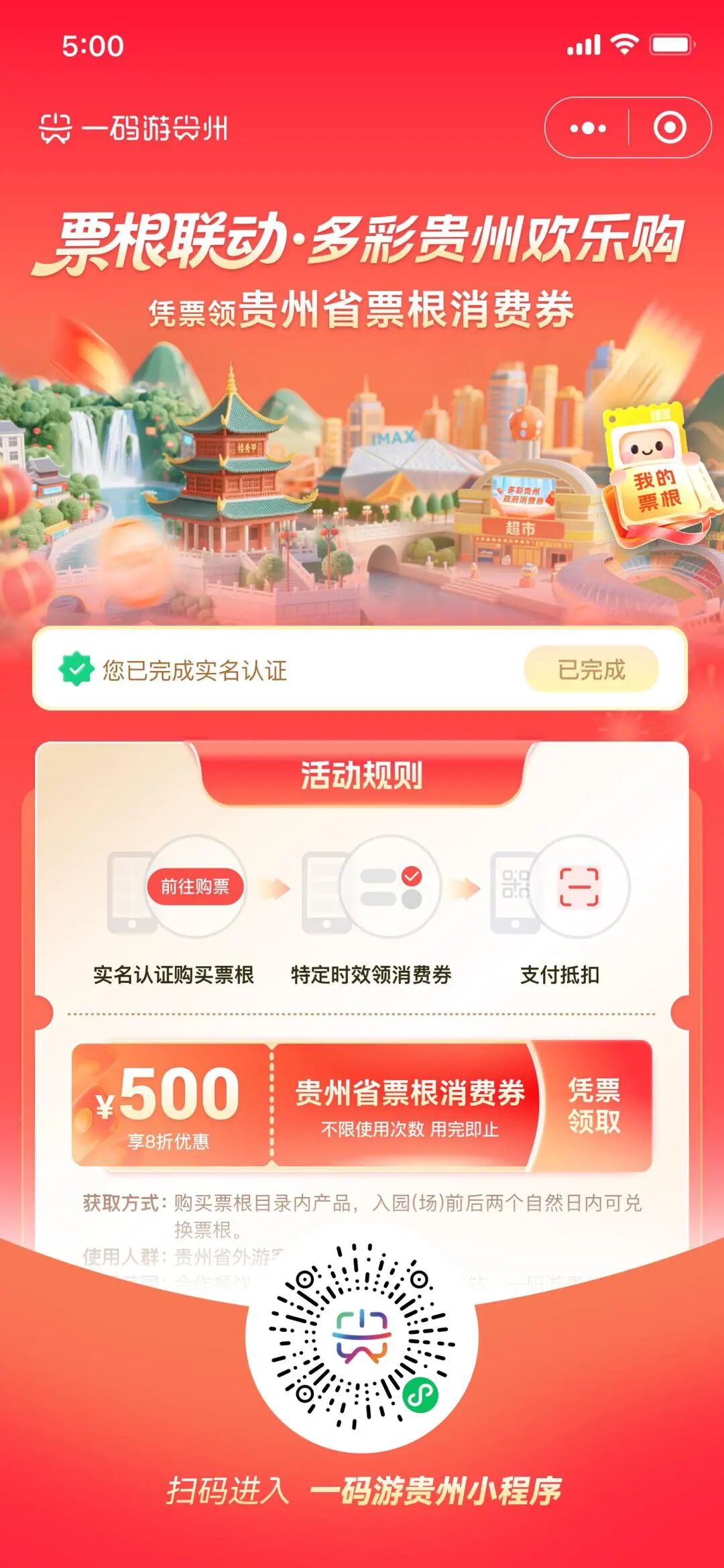 2月3日起至2026年12月31日,省外游客在“一码游贵州”微信小程序或APP上,购买贵州指定景区门票(含西江千户苗寨、肇兴侗寨等热门景区)、体育赛事入场券、演唱会、音乐节门票及重大展会门票,凭上述任意一种电子票根,即可申请领取500元旅游消费券,在全省参加活动的线下餐饮、商超、加油站门店和平台线上购物专区,可享受单笔8折立减优惠。活动还搭建“一码游贵州”线上购物专区,覆盖黔茶、酱酒、农特产品、伴手礼、文创等贵州新春好物,游客朋友可一键下单,快递上门。