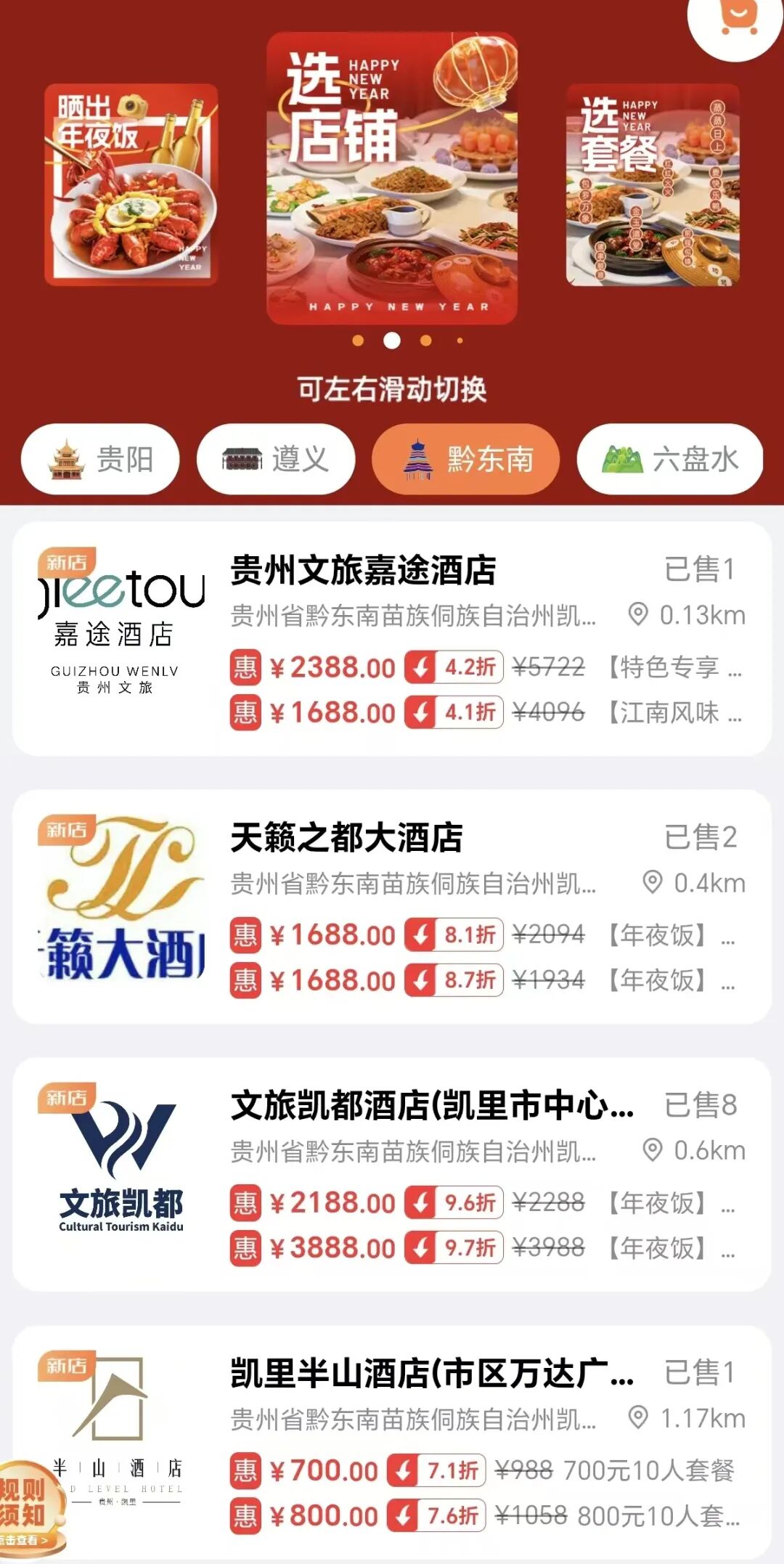 凯里市举办绣里淘年货大集迎新春、“福马踏下司·奇幻满古镇”、“和美凯里·年味中博”、国贸“马上有好市”年货节、“年味香炉山•非遗中国年”等促销和非遗民俗活动,并联动市内80余家优质酒店、餐饮门店推出票根优惠,消费者凭购车发票、高铁票、景区门票等,可享参与门店8.8折优惠。
