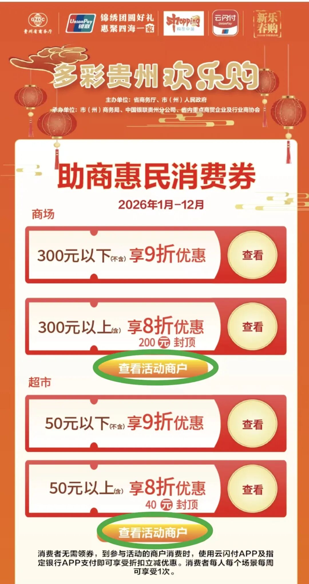 黄平县开展2026年“且兰年味·马跃新春”系列促销,2月8日-3月3日,消费者到年货节集市或参与商场、加油站、餐饮、住宿等企业,支付时扫指定付款码,立享满500元减50元的年货集市券,满200元减30元商超券,满300元减40元的加油券、满500元减50元的餐饮券,从购物年货、购车置业到餐饮住宿、加油出行,真金白银惠民,诚意十足。