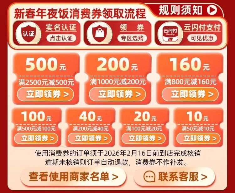 2026年1月10日订黔菜宴·过幸福年”新春年夜饭预订在“一码贵州”平台上线,消费者可到平台“年夜饭专区”领取满2500元减500元、满1000元减200元、满800元减160元、满500元减100元、满200元减40元、满100元减20元、满50元减10元消费券,领券后到平台黔东南专区餐饮商家订购年夜饭套餐,2月16日前到线下餐饮门店消费即可享受满减优惠。从商务宴请到家庭聚餐,从传统黔菜到创新风味,门店团购折扣优惠叠加消费券,全方位满足消费者对年夜饭的不同需求。
