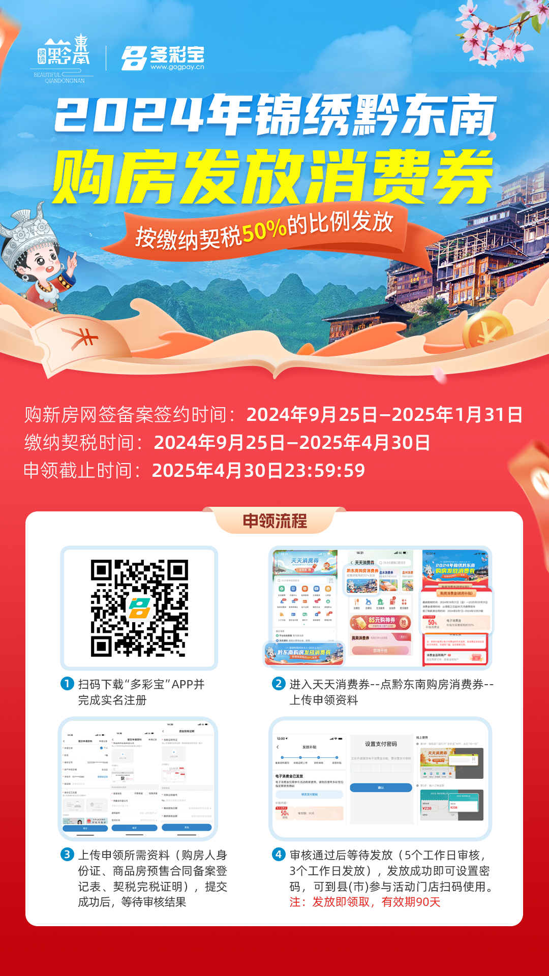 对2024年9月25日——2025年1月31日期间个人在黔东南州辖区内购买新建商品住房且完成商品房预(现)售合同登记备案(备案日期在2025年1月31日前),并于2025年4月30日前缴纳契税的,购房人于2025年4月30日前持商品房买卖合同和契税完税凭证到指定活动平台申领消费券。各县(市)按照购房人实际缴纳契税50%的比例发放消费券补贴。需要注意的是,公寓及公司购房不在此次活动补贴范围内。