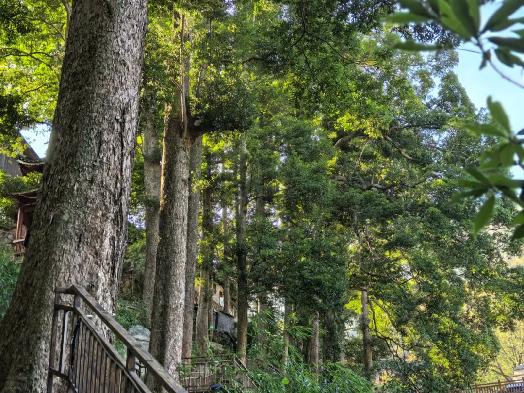 前来的游客们漫步于千年的古楠木林下,或拍照打卡,记录这如诗如画的美景;或品茗闲话,享受悠闲惬意的时光。